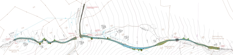Die geplante Linienführung des Gewässers orientierte sich an den Fargue‘schen Gesetzen. Gemeinsam mit Wasserbehörde und Naturschutzbehörde wurden Gestaltungsziele festgelegt. Im Ergebnis ist ein Gewässer mit ausgebildeten Prall- und Gleitufern, ingenieurbiologischen Strukturen und einer ökologisch durchgängigen Sohle entstanden. Der Gebirgsbach soll einen Wiesenbachcharakter erhalten. Mit Schaffung des eigentlichen Gewässerbetts, wurde auch ein Durchlass für einen Weg hergestellt. Dieser wurde so gestaltet, dass eine ökologisch durchgängige Sohle entsteht, die das Gewässer als Lebensraum nicht zerschneidet. Mit der Planung wurden gebietstypische Pflanzen eingesetzt.